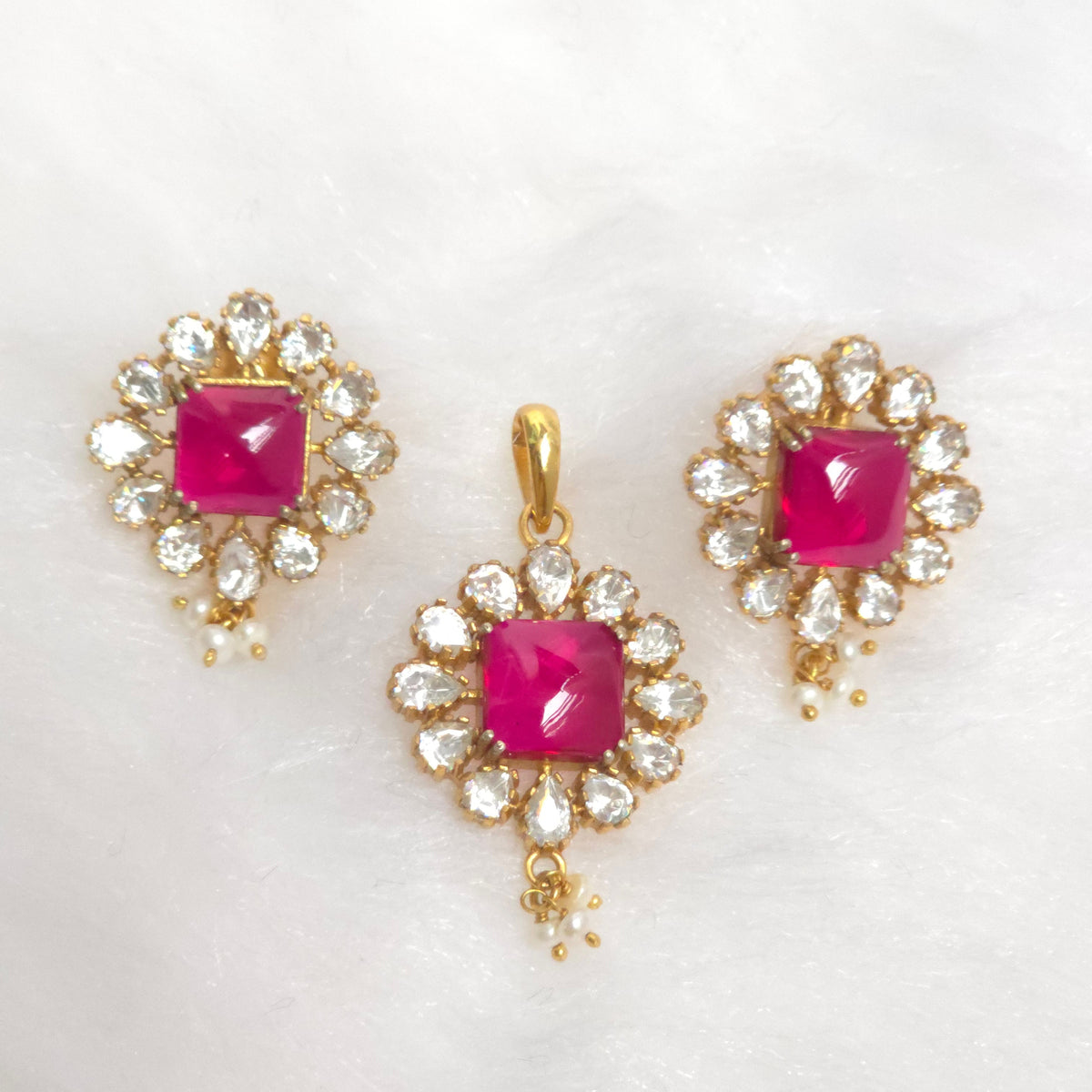 An elegant expression of timeless tradition, the Rosy Glow Pendant Set combines rich ruby tones with regal design elements. Perfect for festive occasions or graceful celebrations, this set adds a soft yet striking charm to any look.